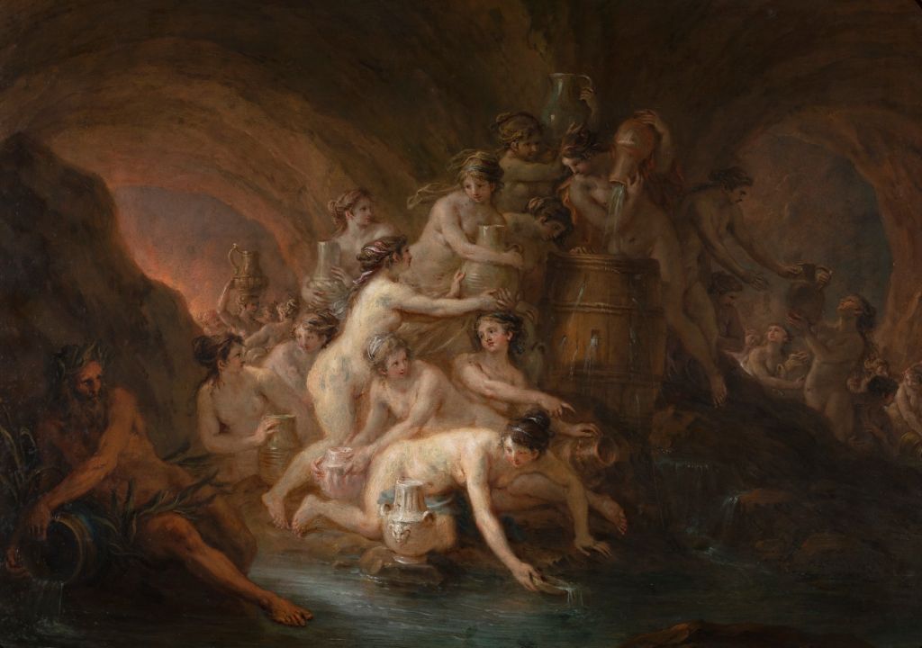 This picture depicts the mythological story of the daughters of Danaus, whose punishment in Hades was that they had to fill a vessel which had no bottom with water from the Styx; the story is told by Ovid in the Metamorphoses (IV, 462 sqs.).