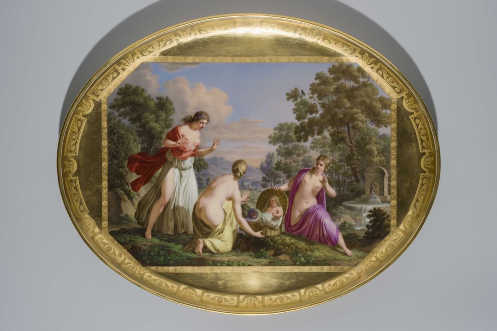 The author of this work, the Austrian miniaturist painter Moritz Michael Daffinger, transferred a now-lost painting by Franc Kavčič (1755–1828) onto the plate, and the scene shows all the characteristics of Kavčič’s style. In 1808, Kavčič became Head and Supervisor of the Painting Department of the Vienna Porcelain Manufactory, the second oldest in Europe after the Meissen Porcelain Manufactory. Moritz Michael was the son of porcelain painter Johann Leopold Daffinger; he was taken on as an apprentice at the porcelain manufactory at the age of eleven. He later studied at the Vienna Fine Arts Academy, where Kavčič was appointed Director of the Painting and Sculpture School in 1820.