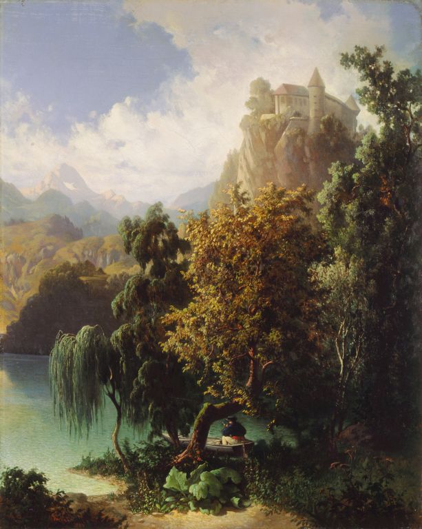 Interest in landscape first appeared as the background of portraits; towards the mid-century first autonomous city vedute emerged. The Biedermaier landscape is idyllic, descriptive, and furnished with staffage figures. Painters were attracted by tourist destinations and locations that were related to homeland identity: Mt. Triglav, Lake Bohinj, Bled. Anton Karinger and Marko Pernhart established themselves as explicit landscapists. The latter became famous for his multi-part panoramas from mountain peaks.
