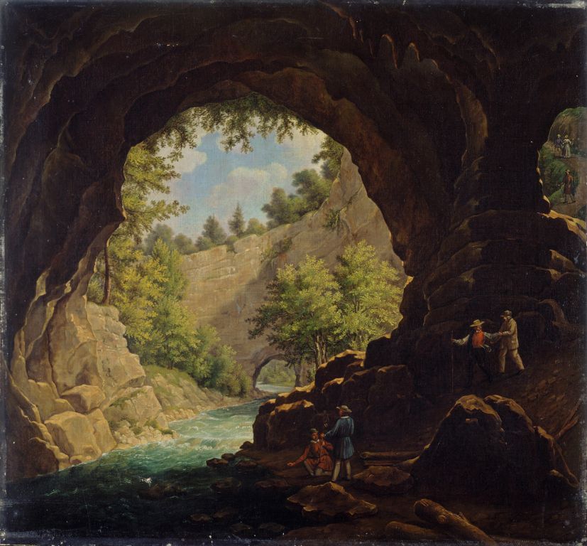 The painter clearly depicted how the current shape of Rakov Škocjan came to be –the karst ceiling collapsed into the cave. In the foreground, there are visitors and a dark arch growing with stalactites, while the background features a sunbaked and silted-up riverbed, with a natural bridge. On the far right, there are even more visitors, attesting to the destination's popularity even back in the 19th century.