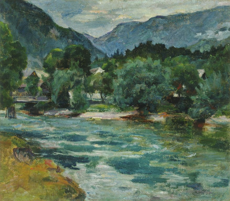 Jožef Petkovšek, too, relied on French realists and traditions of salon painting in his realist plein-air picture Washerwomen by the Ljubljanica. In his Landscape by a River he already dealt with a purely artistic issue of light and reflections, which brought him close to the Impressionist search. In contrast, his interiors are marked with dark, cool metallic colouring with sharp beams of light, which imbues the genre-like protagonists with anxious, frozen expression.