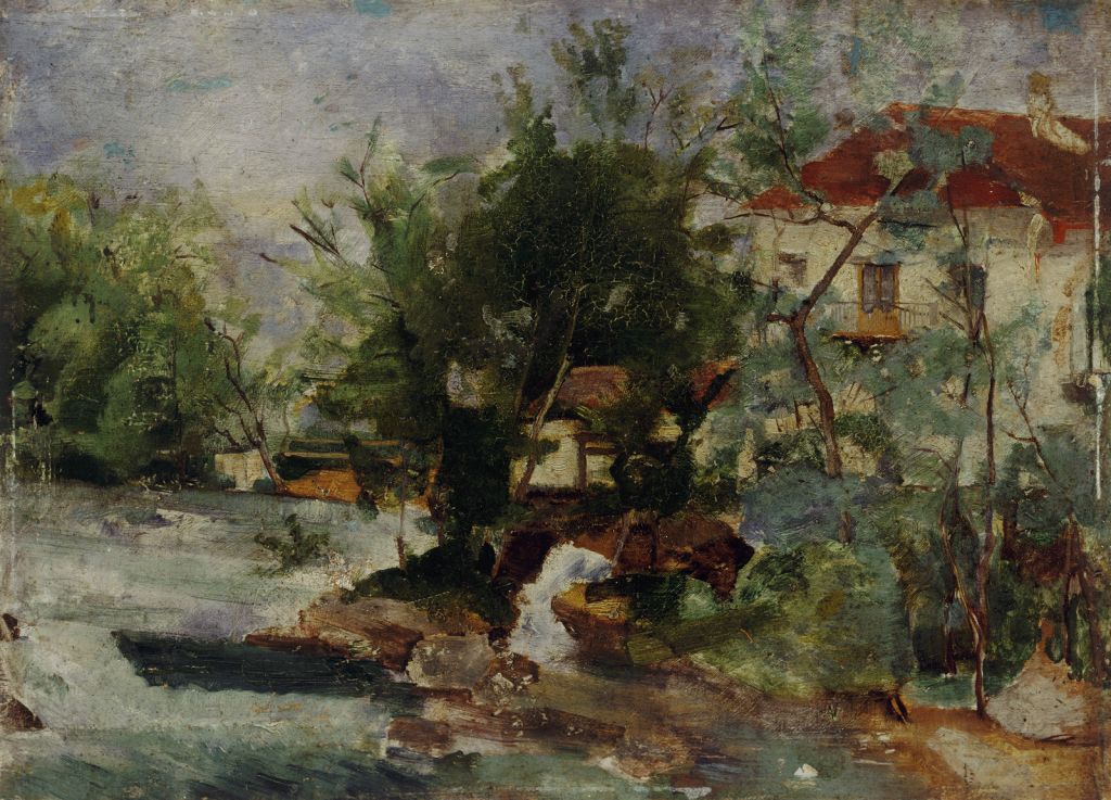 Jožef Petkovšek, too, relied on French realists and traditions of salon painting in his realist plein-air picture Washerwomen by the Ljubljanica. In his Landscape by a River he already dealt with a purely artistic issue of light and reflections, which brought him close to the Impressionist search. In contrast, his interiors are marked with dark, cool metallic colouring with sharp beams of light, which imbues the genre-like protagonists with anxious, frozen expression.