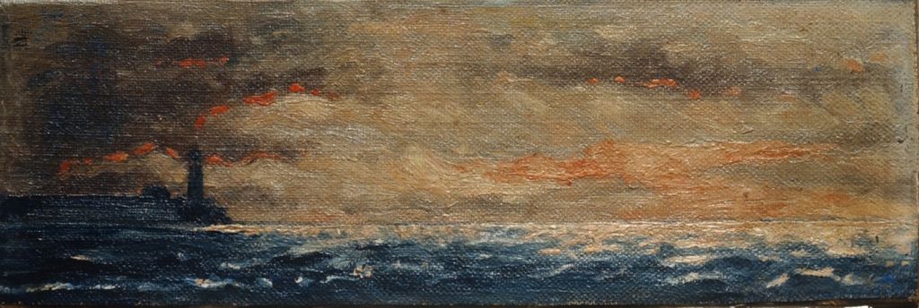 This etude in the use of color to depict water, the sky, and the point jutting out into the sea from the left side of the narrow, horizontally composed painting, whose subject makes it stand out as extraordinary among the artist’s opus. The water’s surface, which occupies the bottom quarter of the small painting, is distinguished by nuances application of blue and black paint, restlessly interspersed by flashes of white. Impasto hues of pink and white thicken into a low horizon as a reflection of the evening sky. Linear brushstrokes of intense red on the right half of the work and around the lighthouse breathe life and illumination into the sky.