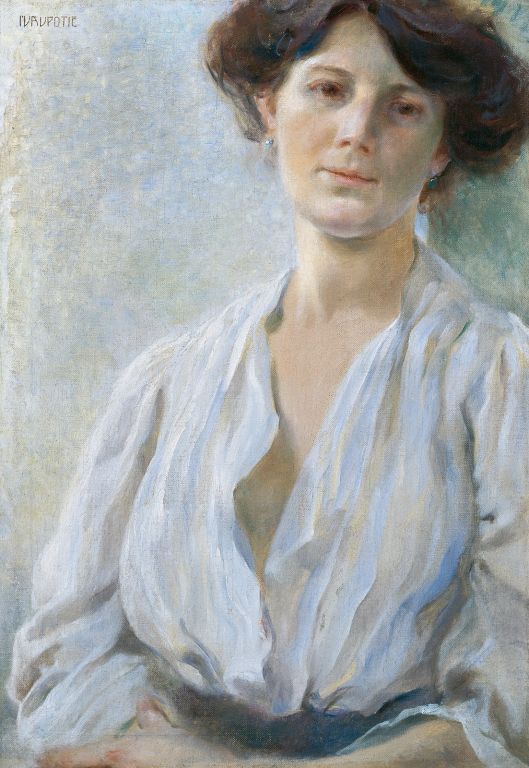 Ivan painted the headshot portrait of his wife beforea light background, showing her in a calm and relaxed mood. Her white, translucent blouse is opened wide and plunging, her head slightly cocked with a dreamy look on her face, and her hairdo, drawn together in the back, is split by a vague part on her forehead. The only jewelry adorning her are hanging earrings. The portrait radiates warmth and proximity, a clear testament to the subject’s intimacy with the painter. Ivan Vavpotič was primarily a portraitist who placed his subjects in surroundings that accentuated their social status. His wife’s countenance is captured in a close-up and her attribute is the familiarity and attraction they share. This realistic rendering is permeated by elements of secessionist art, which use light to play on traditionand embellishment.