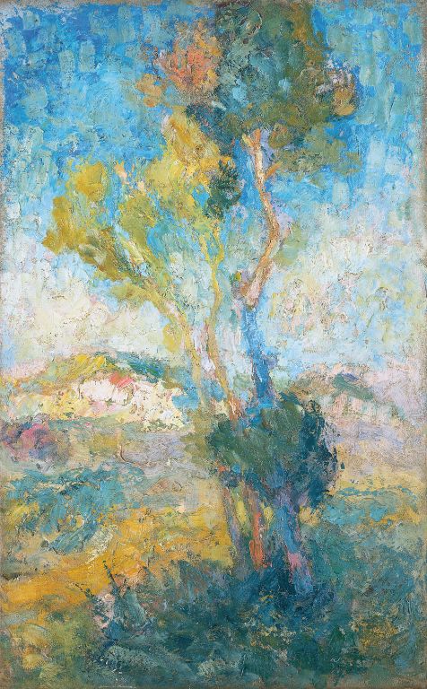 Jakopič took his most important step forward when he decided to direct his experimental energy into landscape painting. In 1901, he and Jama painted together in Stranska Vas. There, Jakopič elaborated certain compositional schemes that became his mainstays over the next 2 decades. Most likely, the later variations of those paintings did not require that he return to the scene of the motif, but were produced as studio riffs on the established scene. His Jagnedi v Jutranjem Soncu (Black Poplars in the Morning Sun), which appeared in 1904 among the prizes for winning the puzzles in Zofka Kveder’s Slovene newspaper Domači Prijatelj in Prague, have an original scheme of somewhat diagonally leaning trees in a narrow, upright format. In his Topoli (Cottonwoods), Jakopič replaced the front lighting with a more vivid color palette and more unrestrained brush strokes. The landscape’s relief, illuminated by the intense light of high noon, is squeezed in between the shadowy foreground and the sky’s successive layers of blue. The color transposition follows the visual information, but a reflection of the painter’s ecstatic experience is found in the tension created by the hues used. Poplar canopies are found in Jakopič’s experimental works between 1903 and 1905, though we usually date this painting to 1912, when the artist’s vibrant palette was again connected to pointillism and he returned to his early motif around Škofja Loka.
