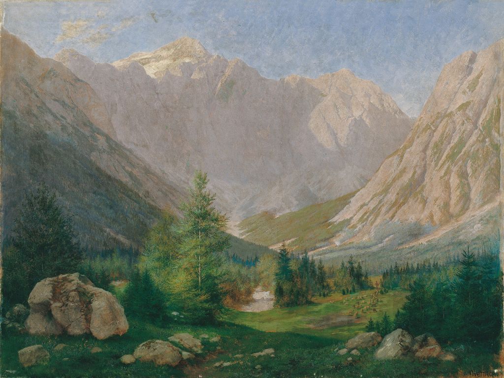 This translucent vista of Triglav and a valley that is today besieged by tourists presents us with a remote and unspoilt natural landscape and a pastoral ideal; at the bottom right of the picture we observe a shepherd and his flock.