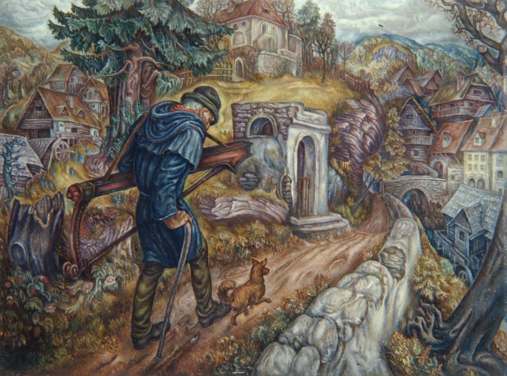 The artistic society Vesna, which included Gvidon Birolla among its ranks, outlined an ambitious social program in the spirit and with the aim of encouraging national awareness, founded on researching autochthonous traditions and national motifs. These motifs were sought in daily agrarian lives, in traditional folklore, traditions, customs, and songs, and in the rustic trades and crafts of the time. Even after the society disbanded, Birolla steadfastly remained committed to researching local iconography, and it was Škofja Loka with its surroundings that supplied him with an inexhaustible source of motifs, including those of squatters and vagabonds, as well as more romantic travelers. A Harpist (Harfist) is a romantic depiction – an old man playing the harp, always on the road, never with a specific destination. Bent over, he approaches the villages, where he is joined by a dog, enhancing the artist’s intention of depicting suadade and isolation.