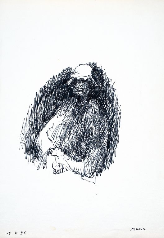 The self-portrait, in which Mušič depicted himself in the spiritual image of the wayfarer, was produced in black marker on paper on 18 June 1995. Originally entitled in Italian, Il Viandante means equally pilgrim and secularly a person who has traversed an especially long path. It also denotes (e)migrants with no homeland and no borders to limit their travels. The drawing is from Mušič’s last creative period, when he was already over 85 years of age.
