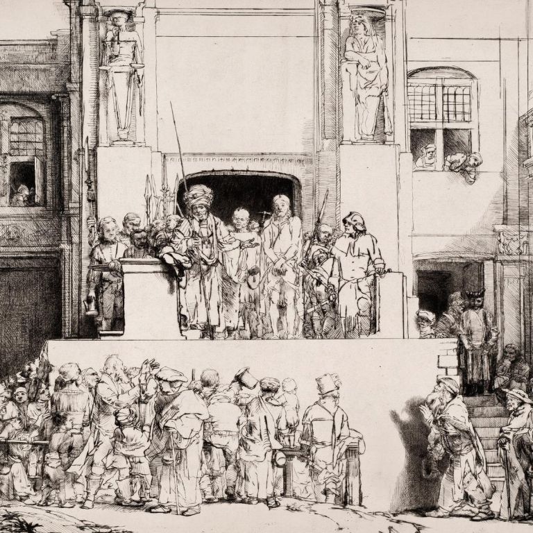 Na razstavi predstavljamo Rembrandtova izvirna dela na papirju in dve jedkani matrici iz zbirke Muzeja Rembrandtova hiša iz Amsterdama. Poleg tega je predstavljenih še 14 umetnin njegovih sodobnikov in kasnejših umetnikov, ki jim je stari mojster bil za vzor, med drugim deli Jamesa Abbotta McNeilla Whistlerja in Pabla Picassa. Razstava nam predstavi Rembrandtovo pripovedovanje zgodb, kako je najprej izdelal in nato združil karakterne študije, žanrske prizore in krajino, da je ustvaril navdihujoče pripovedi, ki nas še danes ganejo s svojim sporočilom ljubezni, vere in upanja.