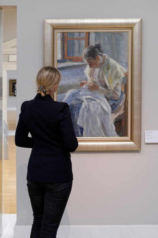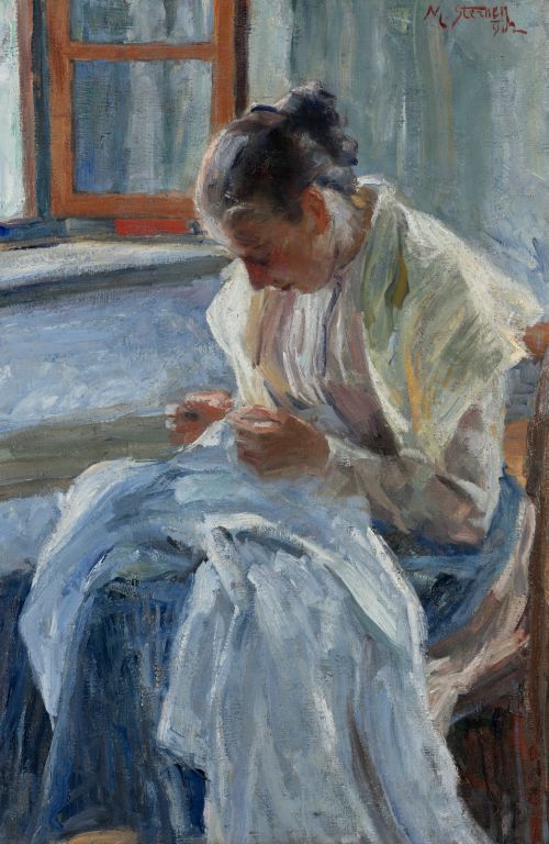 Matej Sternen (Verd pri Vrhniki, 1870 − Ljubljana, 1949), Pri šivanju, 1902, olje, platno, 104,5 × 69,5 cm, sign. in dat. d. zg.: M. Sternen 902; Zbirka Lek