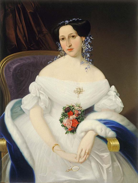 The portrait of Luiza Pesjak could be described as a typical Biedermeier icon. The melancholy on the face of the depicted woman and her gallant posture, together with her selected precious clothing and fashion accessories, make up a romantic idealized kaleidoscope of Prešeren’s time.
