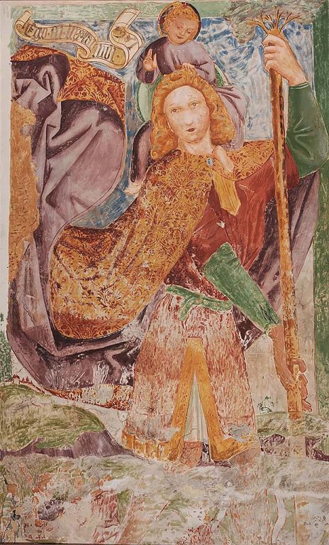 The giant is presented frontally, at the moment when the child’s weight becomes unbearable. So he leans on his staff which in reality is an uprooted tree. The boy on his shoulders is blessing him. The quotation on the banderole reveals the child’s true nature: Ego sum lux mundi (I am the light of the world). It also communicates the year of the origin of the fresco, 1467. The power of the supernatural event is also evidenced by the artificially billowing cloak of the Saint and the grace of his face. The two features are characteristics which help to identify the works of the so-called Master of Mače.