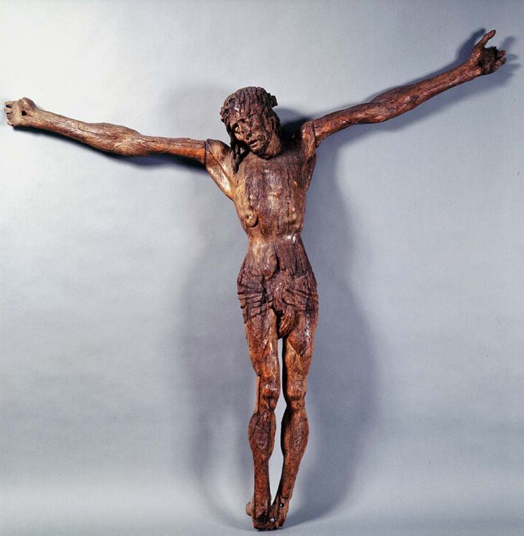 The image of Crucified Christ is a deeply touching, highly expressive presentation of his exhausted tortured body, and face in particular. The slim body is sinewy and its strength flows from the thorax to the shoulders and on, to the bony arms. But the head, crowned with thorns, already drops in a death agony. The sunken half-closed eyes look away from the outer world into the inner world. In extreme pain, the open mouth communicates the last thought on acceptance and forgiveness.