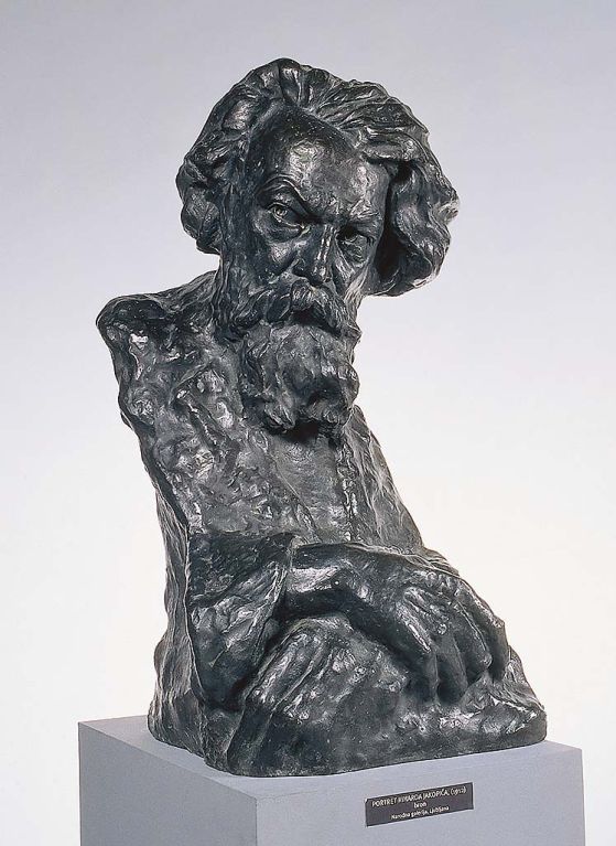 The portrait of painter Rihard Jakopič dates from the time before the foundation of the National Gallery Society and shortly after Jakopič had opened in Tivoli Park the first permanent art exhibition facilities in Slovenia. Formally, the portrait relies on the examples of Rodin-related sculpture. The bearded apostolic face with thick hair, intense gaze with raised eyebrows, and with strong cheekbones emanates powerful and thoughtful life ardour. Exposed are the artist’s strong crossed hands, intentionally oversized. Dynamism is given to the sculpture by the turn of the head, the section of the chest cropped at the sides, and impressionistically rendered restless surface with tiny convexities and concavities as well as conspicuous light contrasts. Formal features of the sculpture nicely summarize the artistic outlook and character of the Slovenian Impressionist painter.