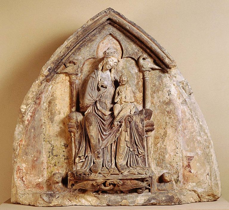 In order to therefore better understand the original symbolic meaning and the expressive impression of the relief, we must use our minds to position the relief over the church door and see it painted in saturated colours, which can today only be sensed in the grooves of the deep folds. How did medieval man understand the symbolic address of a sculptor, known as the Master of the Solčava Madonna?