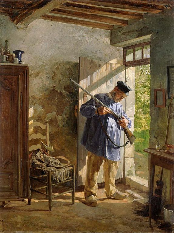 He spent the autumn of 1882 in Normandy, where, influenced by French fellow painters, he created open-air landscape fragments and genre paintings. He stayed with the family of painter Desrivières, carefully preparing the painting Before the Hunt. He produced a series of preparatory drawings for the painting, of the composition as a whole, as well as of individual elements, and colour studies. When he later carefully compiled them into a whole, he still retained a sense of realistic contingency and directness in the finished image. Before the Hunt was the first Slovenian painting to be accepted for exhibition in the Paris Salon in 1883.
