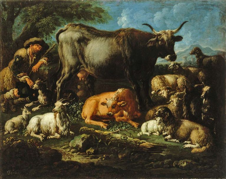 Johann Melchior Roos was a member of a family of painters. His first teacher was his father, Johann Heinrich, a landscape painter. Following in the footsteps of their father were four sons, among whom Philipp and Johann Melchior are the most known. Both brothers painted animals. Although Philipp was more competent, Johann Melchior had a more promising career in front of him: Prince Bishop of Bamberg, Lothar Franz von Schönborn, became his patron, and was enthusiastically buying animal paintings for the newly-built Pommersfelden Castle. Unfortunately, he was greatly disappointed by Johann Melchior’s unreliability and laziness. The people in Frankfurt knew of the painter’s easy-going lifestyle and nicknamed him “Saturday Roos”. It was said that he only painted on Saturdays, when his wife needed money to go shopping.