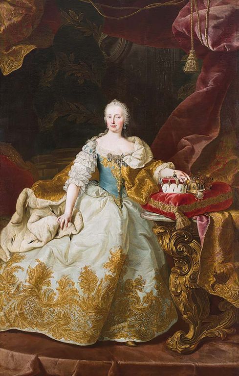 The life-size portrait is set in an interior and shows the young empress in opulent ceremonial robe. The importance of the portrait is underlined by the full-length presentation, three partly seen colossal twisted columns and theatrically raised drapery. The columns are of black marble, with golden laurel garlands winding round them. The magnificent architecture resembles an exterior, so that such a background symbolically marked the public image of the absolutist ruler. On a plush cushion on a small table, there are the most important ruler’s insignia. To the left in the foreground the Austrian archducal crown is laid, behind it there is the Hungarian crown of St Stephen, and in between them the Hungarian sceptre lies. In the background an outline of the Bohemian crown of St Wenceslas can be discerned. With her right hand, Maria Theresa touches her cloak, which is lined with ermine fur. Because of its rarity and symbolism, the latter was reserved exclusively for rulers.