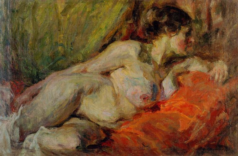Matej Sternen worked closely with Anton Ažbe until the master’s death. Through academic study and Ažbe’s example, the nude became one of his primary concerns. The nudes produced between 1910 and 1914 represent real artistic advancement and the greatest contribution to Slovene modern painting. A naturalistic sensuousness and an erotic note are openly expressed in these nudes. With well thought out colour contrasts and a sensuous materiality of colour, Sternen accentuated the physical presence of the body, its weight and curves to such an extent that one can almost touch and feel the depicted figure.