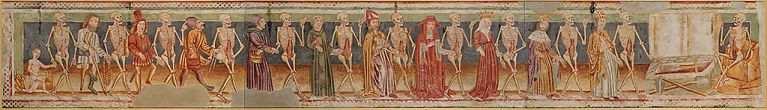 Anche se Danza macabra è il nome consolidato per la famosa scena, non è davvero una danza ma una processione di coppie. Ci sono undici coppie che combinano uno scheletro e un rappresentante dell'umanità di diversa età e condizione. L'umanità è rappresentata da un bambino, uno storpio (mendicante), un giovane (cavaliere), un mercante, un avaro, un monaco, un vescovo, un cardinale, una regina, un re e il papa. La processione si sposta tranquillamente dalla culla alla tomba. Seduto su un trono di pietra è il dodicesimo scheletro che sostiene il coperchio aperto di una tomba murata; accanto ad esso giacciono a terra una zappa e una vanga.