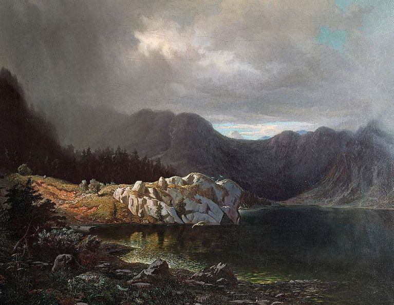 The painter was fascinated by the dramatic pre-storm scene of the lake. The tension in the landscape is conveyed by threatening clouds, foggy haze, dark surface of the lake, mighty spruces, exposed boulders and the mountain mass in the background. The variety of natural forms is enhanced by the contrasting illumination of the scene and the painter’s specific rendering of water and reflections. The birds flying low above the surface add the final romantic accent to the captured moment of a mighty nature. Karinger depicted the same section of the lake also in watercolour but in a more optimistic mood – with a rainbow after the storm.