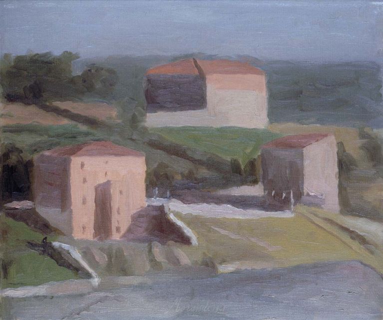 Grandi case in un sobborgo di Bologna, poste su una collina, sono immerse in una luce immobile e senza tempo che non conosce né l'alba né il tramonto. In completo silenzio, vive con la vita interiore di un pennello eccezionalmente attento, limitato all'essenziale, utilizzando una scala ridotta di marroni armoniosi e toni tenui.