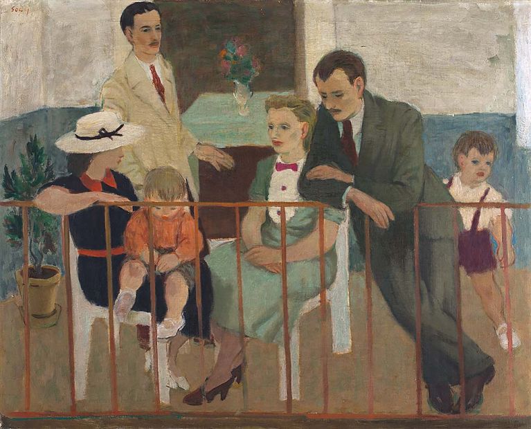 Avtoportret slikarja v svetlem oblačilu, skupaj s pražnje oblečenimi družinskimi člani in prijatelji, nas popelje v lirično ubran, a vendar ograjen svet. Sedej je s tekočo risbo najprej začrtal geometrijo in ritem prizorišča ter vanj vstavil uravnoteženo figuralno kompozicijo. Z barvnimi ploskvami je odprl ali zamejil prostor in vanj povabil svoje drage. Čeprav elegantni, usklajeni in mirni, odrasli umikajo poglede, skrivajo obraze in čustva. V svojih otrplih držah se zdijo ujeti v času. Dinamični moment vnašata v razpoloženje otroka: mlajši, ki z nogico brca proti gledalcu in slikarjev prvorojenec, ki se zvedavo postavlja na desni. Na premik kaže tudi slikarjeva izprožena levica, razgibanost pa v svet vertikal in horizontal prinaša tudi diagonalno na ograji sloneči moški na desni.
