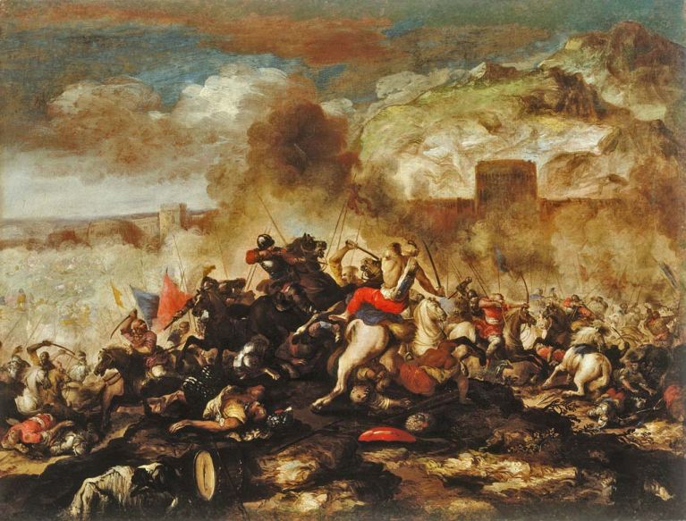 The picture shows a fierce cavalry battle between the Christians and the Turks, whom we recognize by their clothing and hairstyles. The battle rages beneath the walls of a city with a mountain close by. Images of battles against the Turks were very popular in Italy and in Central Europe when Vienna was threatened by the Ottoman Empire and after the victory of 1683, when the city was saved and the invading army slowly retreated. As is usual in such paintings, the place and the event are completely fictional and only symbolically recall the battles of the imperial army against the Ottoman forces.