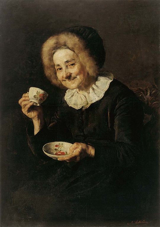 The Woman Drinking Coffee can also be classified as one of those successful genre scenes, a piece that the painter was especially fond of and in later years did not want to sell. The painting was first exhibited in Ljubljana in 1889, on the second floor of the high school, and has been designated by some as Kobilca’s best painting. It is a perfect example of the realistic genre of Munich, which was inspired by the Dutch masters of the 17th century. The artist painted it following a model and also produced several studies of the old lady’s head in different rotations.