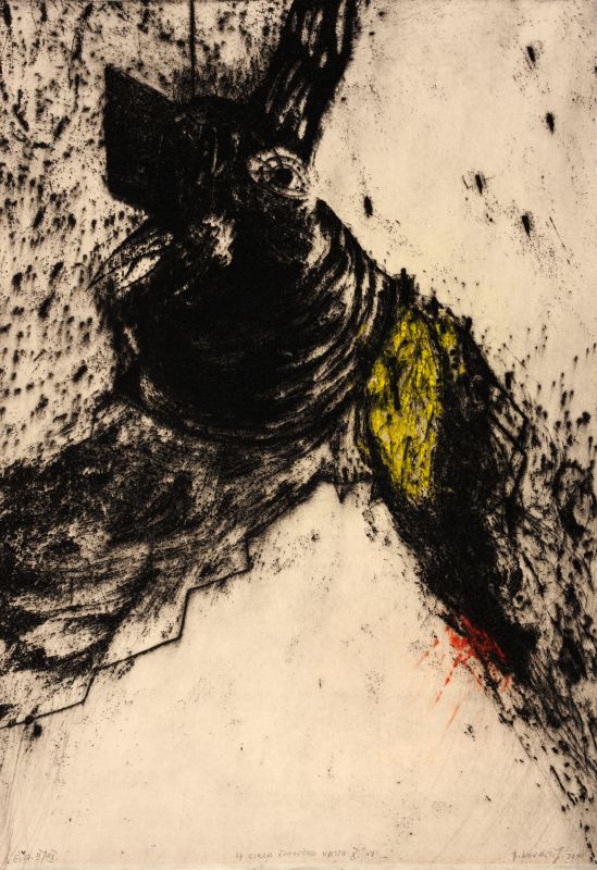 Če pogledamo na post-medijsko obdobje v grafiki, je njeno tendenco mogoče opisati kot razpiranje reže − oddaljevanje matrice in odtisa. Celo za matrico ne vemo več, ali je še »negativ«, vemo le, da je vir, izvor odtisa. S ploščka ni mogoče razbrati, kako je nastajala digitalna matrica. Kovačič se temu upira. Ko drži v rokah obdelano cinkovo ploščo on, govori o vojnah, o zapisu bojevanja z materialom, z medijem, s svetom in s samim seboj. Klasična vrezna tehnika ima preizkušena sredstva za oblikovanje takšnega sporočila, njeno preživetje poplave novih tehnologij in medijev pa je dokaz, da nas more s svojo sporočilnostjo prepričati tudi danes tako kot nekdaj.