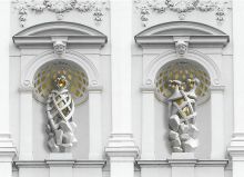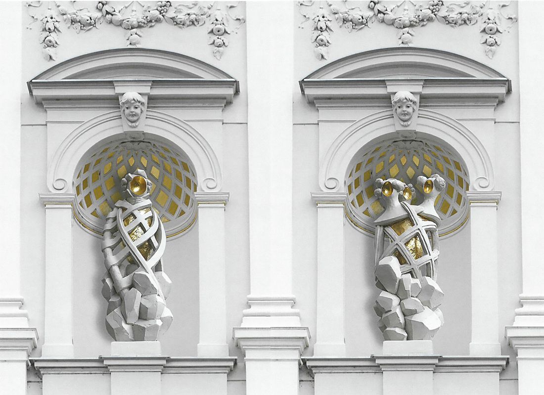 mestom. Skulpturi je avtor prilagodil obliki niš, iz katerih je povzel okrasje