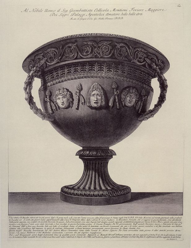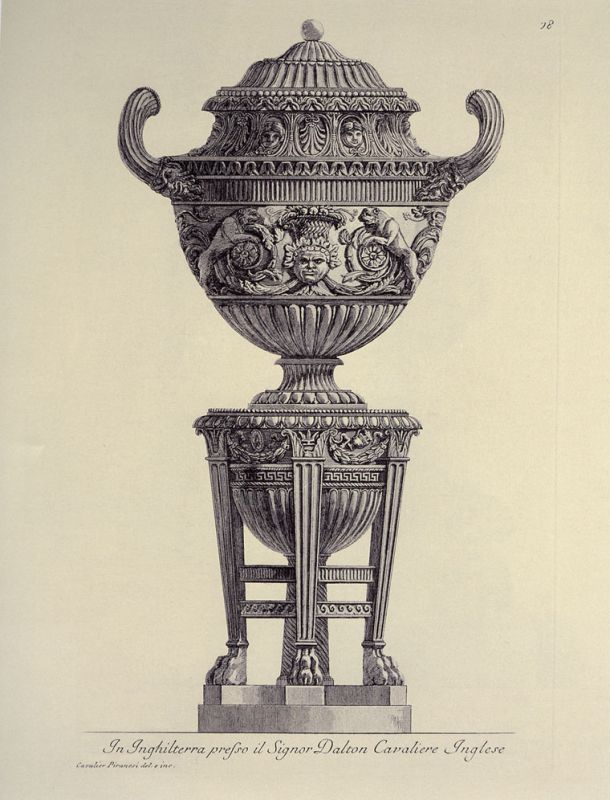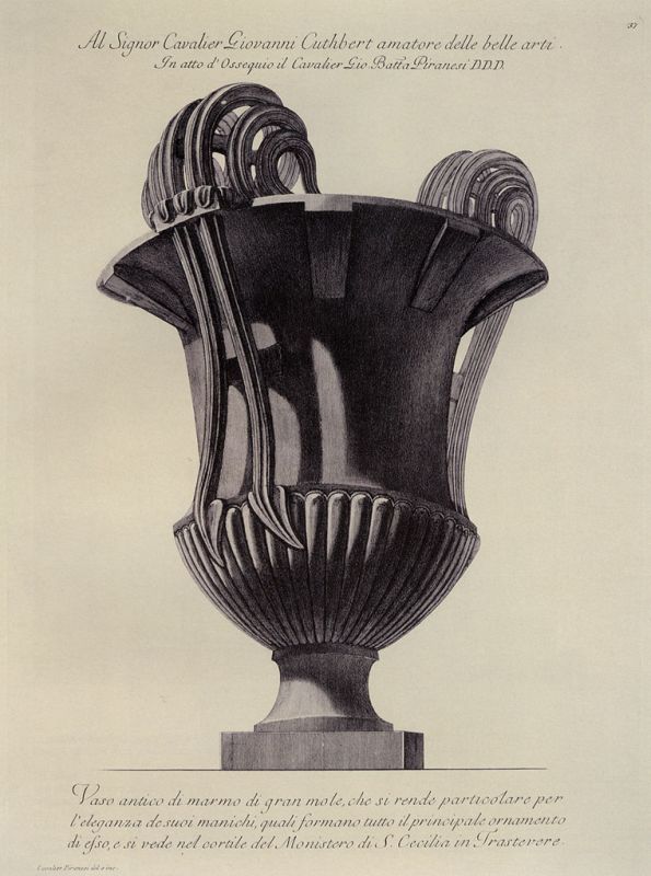 V seriji jedkanic Vasi candelabri cippi sarcofagi tripodi lucerne ed ornamenti antichi (Rim, 1778) Piranesi posreduje svoj pogled na antični Rim z upodobitvami okrasnih predmetov rimske umetnostne obrti. Te jedkanice so nastale v zadnjem desetletju njegovega življenja kot rezultat intenzivnega zbiranja in restavriranja klasičnih starin in pozneje tudi trgovanja z njimi.