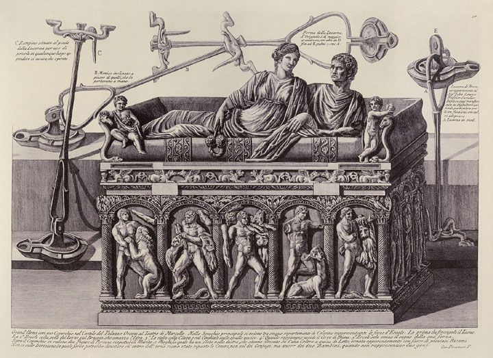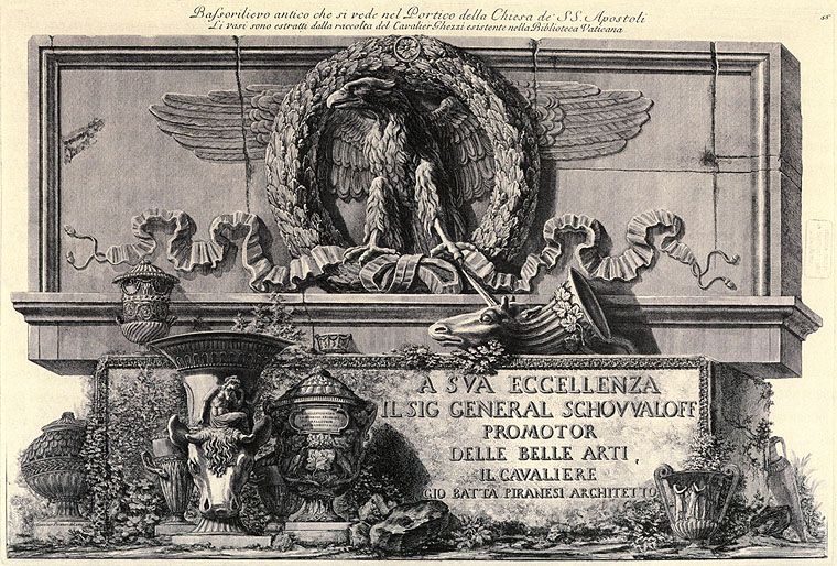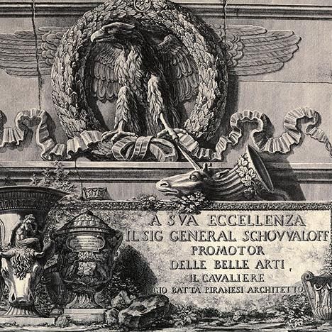 Piranesi je danes znan po svojem fantastičnem grafičnem ciklusu I Carceri. To pot ga spoznamo kot rezca arheoloških predmetov antičnega Rima, ki se z manj zgovornim gradivom izkaže za enako domiselnega aranžerja kompozicij in animatorja detajlov. Čeprav je bil namen takšnih grafičnih map utilitaren - dokumentcijski in pedagoški, je arhitekt in sijajni grafik tudi v to nalogo vlil tisto domišljijo neznanega, nenavadnega, zaradi katere ga je André Breton uvrstil v surrealistični panteon predhodnikov nadrealizma.