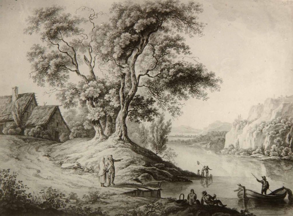 s hišami, drevesi, ribiči in popotniki, ok. 1800