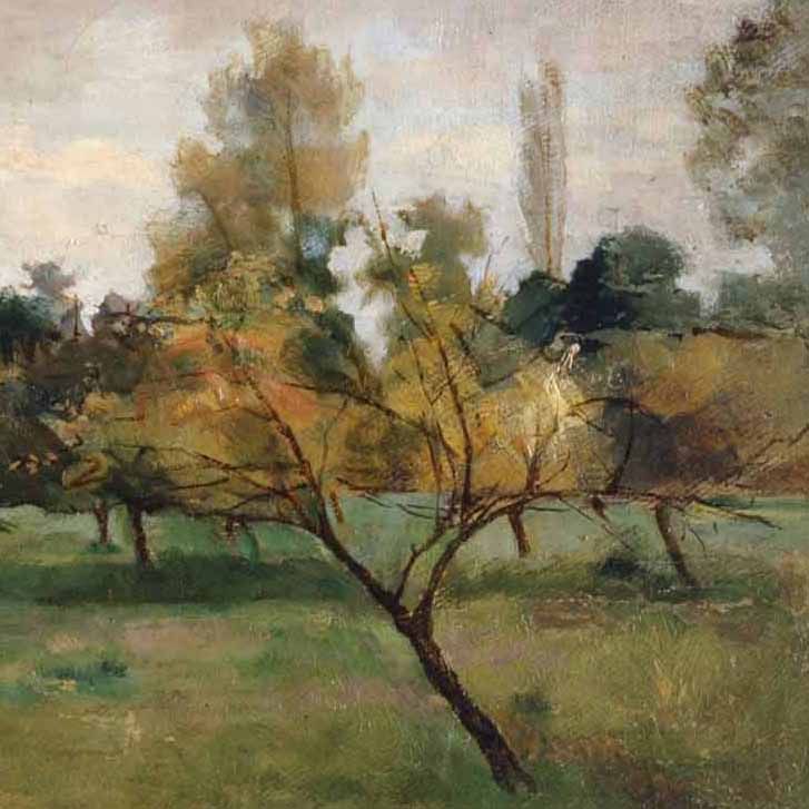 Courbetov hrast je prav toliko hrast kot kos poslikanega platna. Slednjega ne skriva, vendar so očesu razkrite poteze urejene v prepričljivo podobo drevesa v metonimičnem izrezu. Povezava z galsko zgodovino razodeva slikarjev namen heroizirati drevo, ki ga doseže z uporabo konvencije portreta in razmerja med drevesom in krajino ter v razmerju do drugih dreves. Jurij Šubic pa se je zagledal v jablanov sadovnjak v prihajajoči jeseni z otožno svetlobo, ki se zliva z delno zastrtega neba čez skupino dreves. Tudi tu so slikarska faktura, sled čopiča in njegov ritem bistveni del estetskega učinka. Estetskega izraza slike ne nosi več poskus opisovanja detajlov v prepričljivo iluzijo, temveč sugestivnost slikarjeve poteze. K razpoloženjski ubranosti pa prispeva prav toliko značaj jablanovih dreves, ki ostajajo prepoznavna kljub ozaveščenosti slikarskih sredstev. Sliko lahko upravičeno opišemo kot lirično podobo čustvenega doživetja motiva, ki ga slikar posreduje gledalcu.