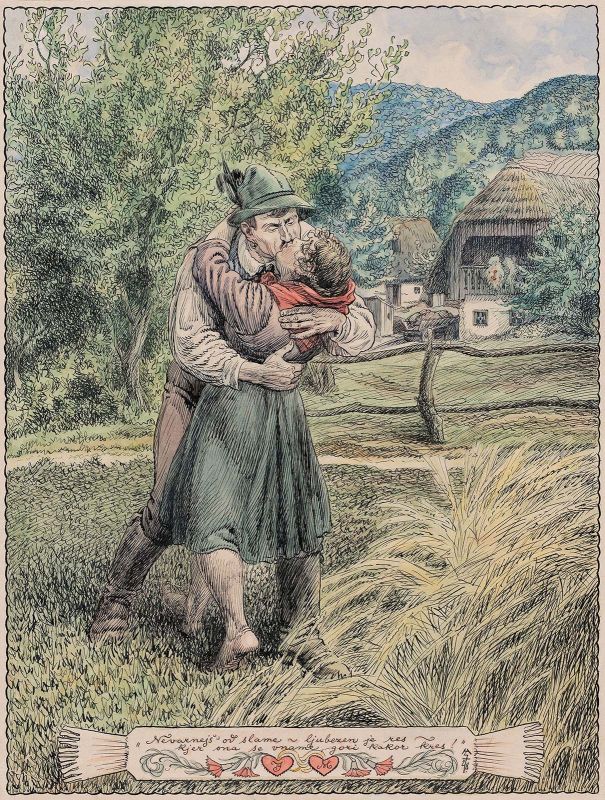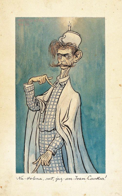 ena izmed mnogih karikatur Ivana Cankarja ter Poljub s tipično gorenjsko pokrajino v ozadju.