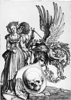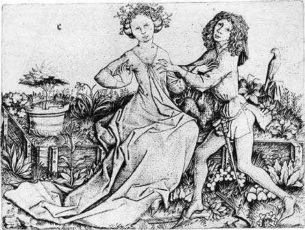 K najljubšim motivom dvorske ljubezni (‘minne’) je sodil pomladni ljubezenski vrt, ki je postal moderen predvsem zaradi francoskega dela Roman de la Rose (1240/1280). Ta idilični kraj dvorske galantnosti je oživil najpomembnejši grafik iz zgodnje dobe bakroreza, okrog leta 1460 v Zgornjem Porenju delujoči Mojster E. S., z nespametnimi mladeniči in devicami, brezsramnimi vlačugami in figuro norca, ki nastopa kot utelešenje in komentator nespameti. Ustreza tako dvornemu norcu kot tudi obscenim pustnim norcem v pustnih burkah in na karnevalu, kjer je bilo enkrat na leto dovoljeno skoraj vse. Tudi v temah t.i. ženske moči, neenakega para, plesa Moriskov in minljivosti posvetnih radosti je bila upodobljena nespamet ljubezni.