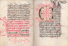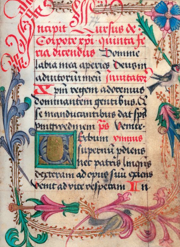 Fleuronnirano okrasje je najprej nastopilo v francoskih rokopisih. Značilne oblike fleuronnéeja iz pariških oziroma staronizozemskih delavnic nam na razstavi prikazujejo trije biblični rokopisi, ki so nastali v 13. stoletju in so k nam najbrž prišli po redovnih (cistercijanskih in kartuzijanskih) povezavah. S francosko-mozanskim krogom zgodnjega 14. stoletja pa se povezuje nastanek bogato in duhovito slikarsko okrašenega rokopisa (NUK, Ms 33), ki vsebuje Monaldovo enciklopedijo kanoničnega prava.