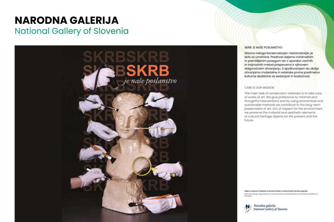Narodna galerija se na razstavi predstavlja s plakatoma V prijetni družbi in Skrb je naše poslanstvo, ki ju je zasnoval Oddelek za konserviranje in restavriranje Narodne galerije.