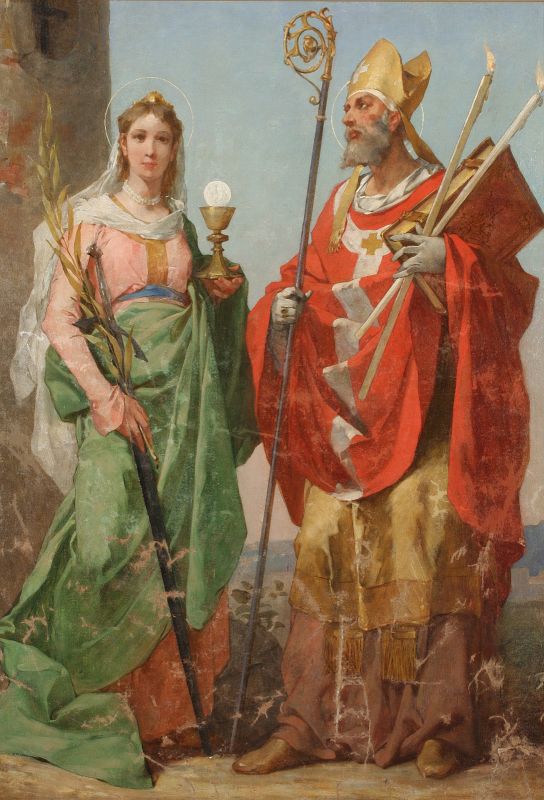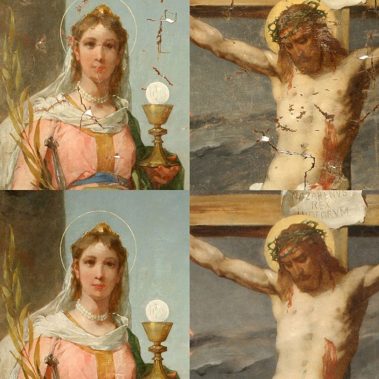 Bandero je bilo v restavratorski postopek prevzeto leta 2013, toda pred tem so bili na njem že opravljeni posegi, a le na strani s podobo sv. Barbare in Blaža. Platno je bilo vpeto v okrasni okvir na način, da se vidi le ena, boljša oziroma zanimivejša stran. Sodobni pristop pa za tovrstne obojestranske podobe narekuje celostno obravnavo, tako da sta vidni obe strani. Problema tega na pol restavriranega bandera smo se lotili tako, da smo najprej "derestavrirali" lice podobe, in šele zatem je sledilo ponovno konserviranje in restavriranje. Če pa v preteklosti uporabljene substance niso lahko odstranljive, se stranski škodi težko izognemo. Kot je bilo mogoče videti že na pogled in kar se je izkazalo tudi med restavratorskim postopkom, je bilo platno že pred prvim posegom v zelo slabem stanju. Zaradi uporabe ob različnih vremenskih razmerah in tudi zaradi staranja materiala je bilo ne le na več mestih prepognjeno in natrgano, ampak tudi izrazito krhko.