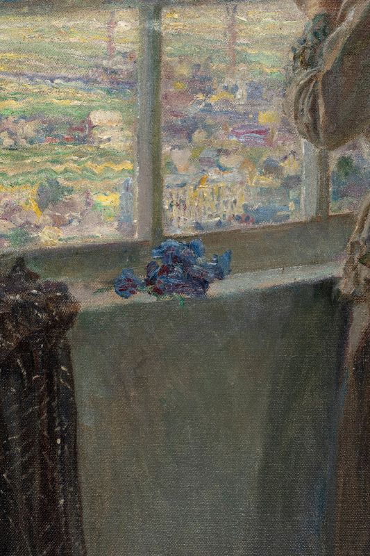 nam razkriva smer njenega pogleda. Ženska figura ne zre skozi okno na mestno