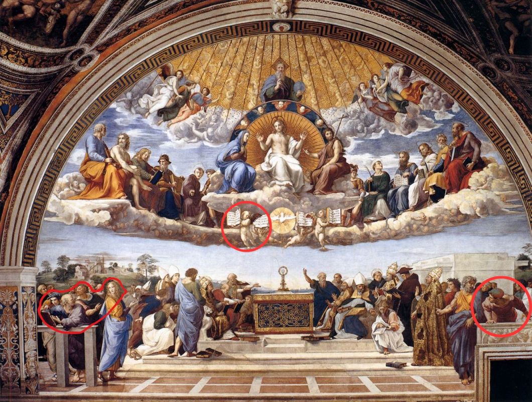 Tudi v skicirkah najdemo risbe, posnete po Rafaelovih delih v Stanzah. Iz Stanze della Segnatura je povzel prizor Izvirnega greha, posebej natančno je risal Evino figuro, s kompozicije Moč, Resnica in Zmernost je narisal sedečega angela s skrajne desne. S prizora Disputaje prerisal angela s knjigo, z iste freske je povzel mladeniča, ki se sklanja čez balustrado v desnem kotu in figuralno skupino, zbrano v levem spodnjem vogalu. Slednja je natančna študija svetlobe in izrazov. Ob skrbni risbi je poudarjeno senčenje, izrazit je kontrast med izraznostjo starčevskega bradatega in milino mladega obraza. V Stanza d’Eliodoro je s freske Izgon Heliodorja iz templja prerisal klečečo žensko postavo iz ospredja na levi. V Vatikanskih Loggiah je risal tudi figure s kompozicij Rafaelovih učencev, tako figuri Eve in Boga iz prizora Stvarjenja in Boga očeta iz Stvarjenja živali. Slednja risba je kolorirana, prav tako prerisana angelska trojica s fresko poslikave v kapeli Chigi v cerkvi s. Maria della Pace.