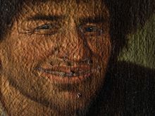 posledica vandalizma. Preluknjano platno je v preteklosti s kapljicami voska zakrpal