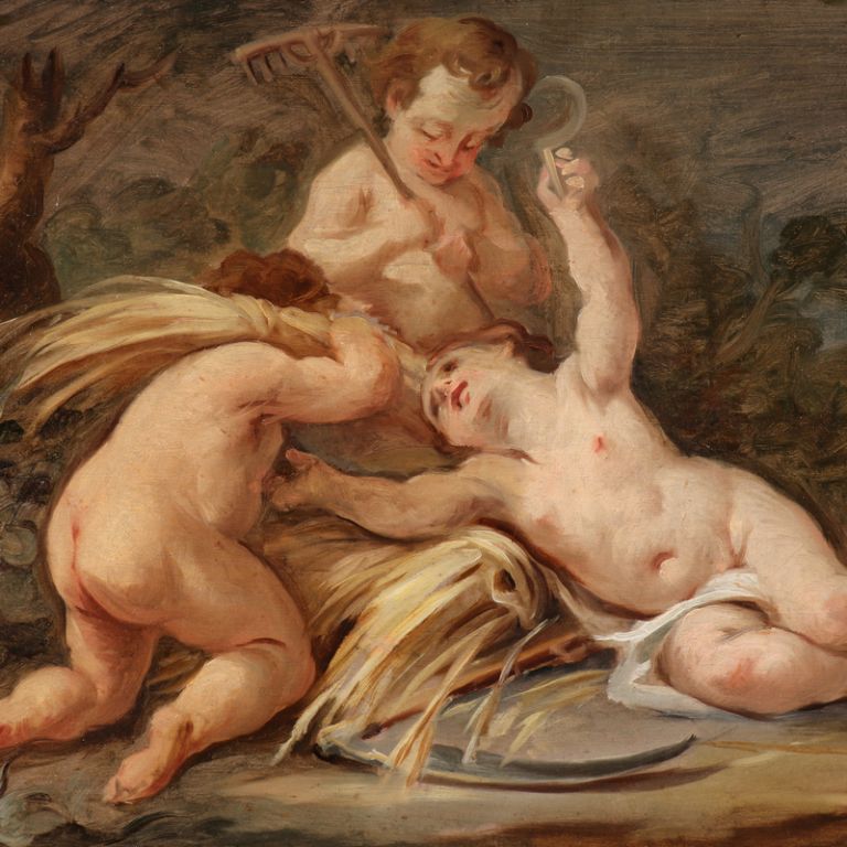 dečki (putti), ki so v obliki piramide postavljeni v sončno pokrajino,