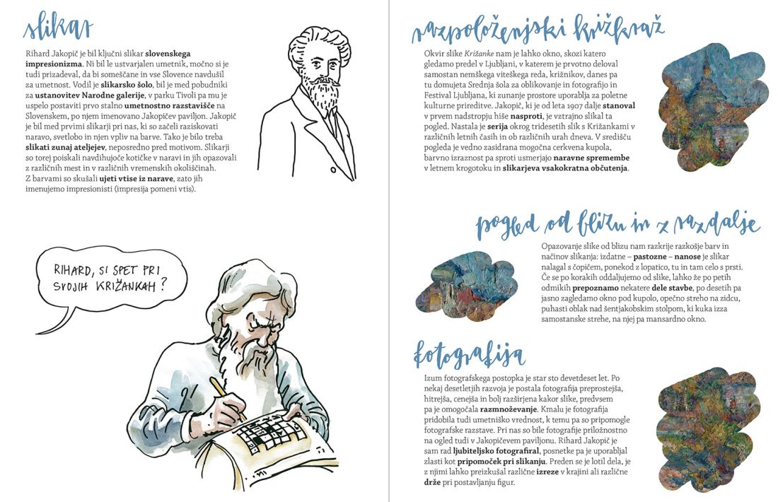 likovnimi posebnostmi. Opisi so začinjeni še z duhovitimi stripovskimi vinjetami ilustratorja Jakoba Klemenčiča.