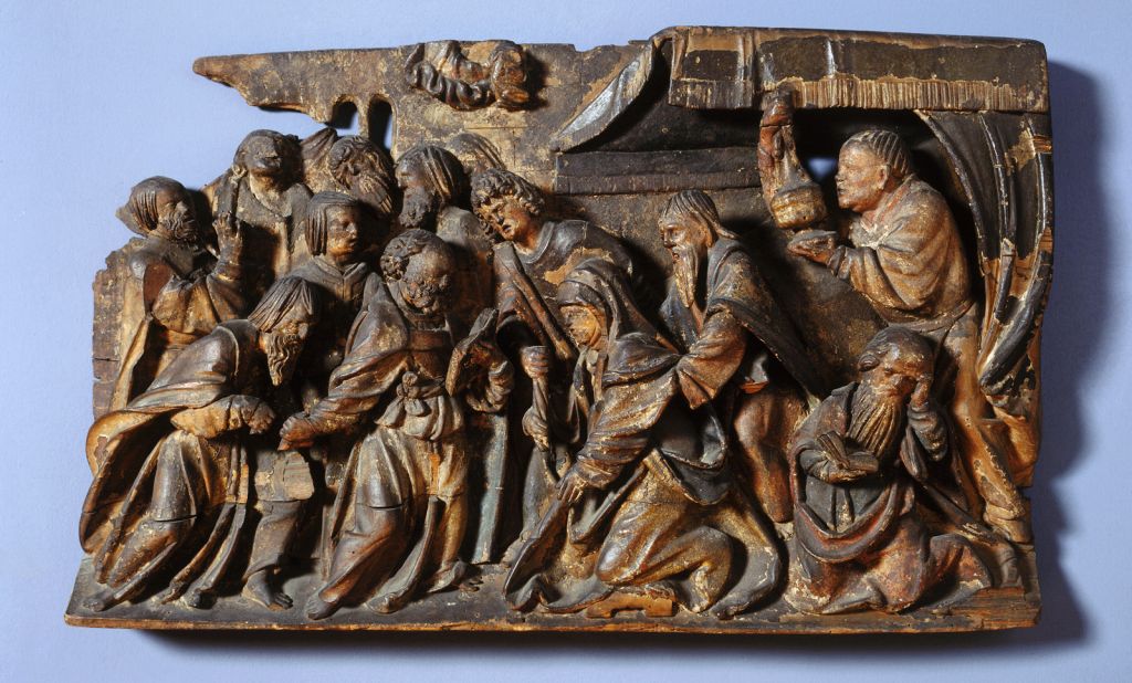 Rezbar je reliefni prizor postavil ob baldahinsko posteljo v notranjščino sobe z bifornim oknom. Po apokrifnih virih so apostoli prihiteli h Kristusovi materi, ko so izvedeli, da umira. Opraviti imamo s t. i. češkim tipom Marijine smrti, ko umirajoča kleči ob postelji. Ujet je trenutek, ko jo zapuščajo moči in jo eden od apostolov z zadnje strani podpre; pomaga mu Janez, ki iz Marijinih rok prevzema palmovo vejo, ki naj bi jo, kot je bilo v navadi, nosili na čelu pogrebnega sprevoda. Ob osrednjih figurah se gnetejo apostoli, od katerih nekateri berejo brevir – pripravljajo se na pogrebni obred, na skrajni desni pa Peter kadi s kadilnico. Na levi polovici zgoraj je le fragmentarno ohranjen Kristus na oblakih, ki je prišel po materino dušo.