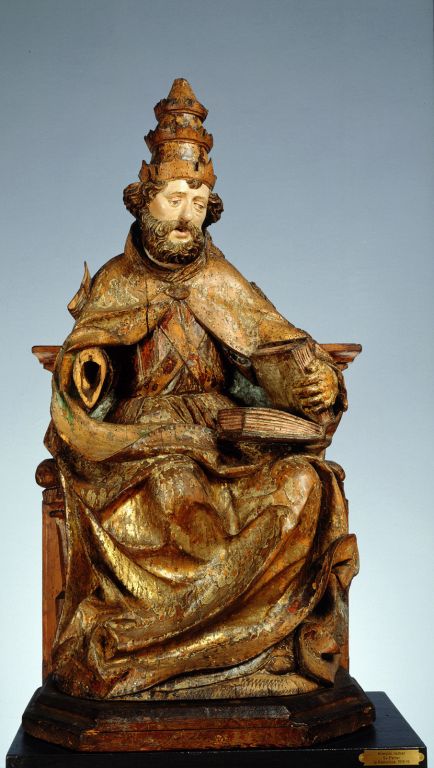 Kip je bil nekoč morda v poznogotskem oltarju, izdelanem za novo ž. c. v Radovljici (ladja nosi letnico 1495). Svetnik s tiaro, ki ga označuje kot papeža, sedi na prestolu. Z levo roko razpira na levem kolenu slonečo knjigo, v dvignjeni desnici je najverjetneje držal ključe. Rahlo vstran nagnjena glava, živahno razgibana draperija spodnjega dela plašča in velikopotezni zamah rok ustvarjajo vtis dinamike, skupaj s svetnikovim izrazom pa tudi duhovne razgibanosti.