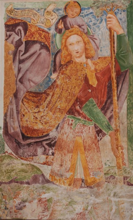Kopija srednjeveške freske iz podružnične cerkve sv. Miklavža v Mačah nad Preddvorom nam približa enega najpogostejših motivov gotskega slikarstva pri nas. Slikovito razgibana in živopisna podoba kaže priljubljenega svetnika sv. Krištofa. Legenda pravi, da je bilo njegovo prvotno ime Reprob, da je zrasel v velikana in iskal najmočnejšega vladarja sveta, da bi mu služil. Po zapovedi puščavnika, naj na svojem močnem telesu prenaša ljudi prek bližnje reke, je nekoč prek vode pomagal majhnemu otroku. Ko sta bila sredi reke, je breme postajalo vse težje, na drugi strani reke pa se mu je otrok dal prepoznati kot Kristus in ga krstil za Krištofa (Christoforos), kar v grščini pomeni Kristonosec. Sv. Krištof je postal priprošnjik zoper naglo smrt. Med ljudmi se je namreč utrdilo zaupanje, da zadostuje, če navsezgodaj pogledaš svetnikovo podobo, pa tisti dan ne boš umrl nenadne smrti. Zato so v srednjem veku marsikje naročali njegovo podobo v nadnaravni velikosti na zunanjščini cerkve.