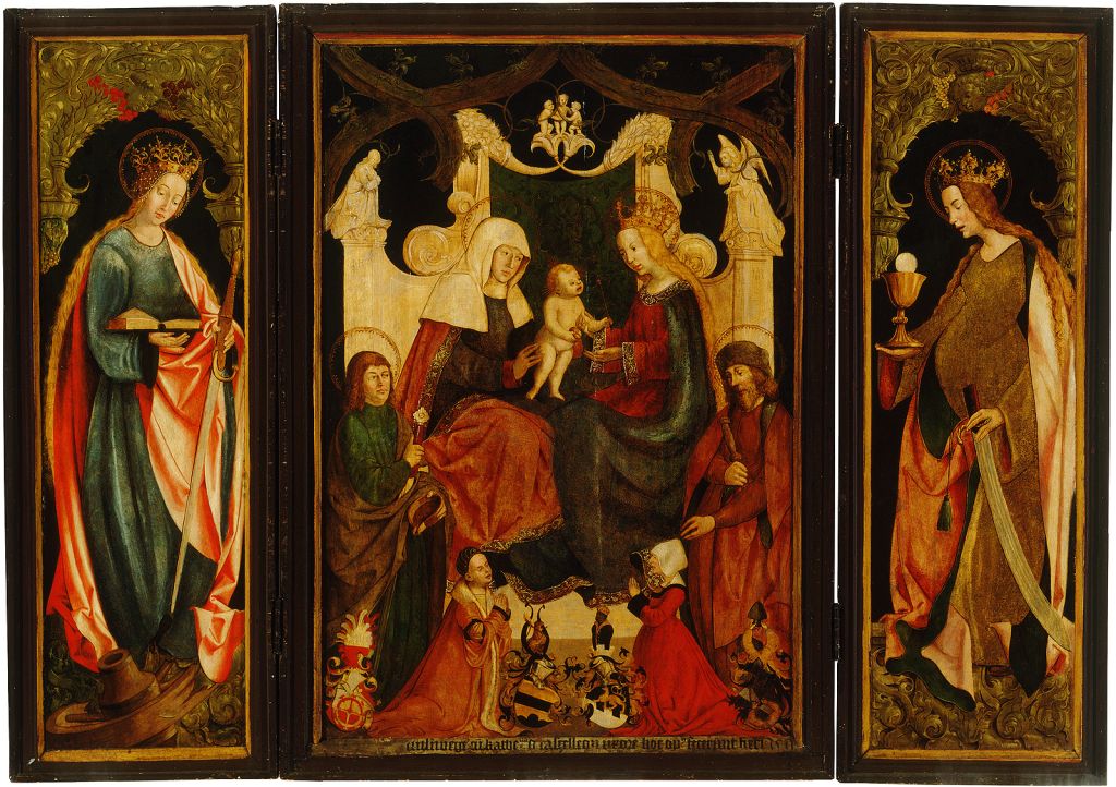 Triptih obsega le glavni del oltarja brez predele in zgornjega zaključka. Osrednja tabla predstavlja na kamnitnem ali slonokoščenem prestolu sedeči sv. Ano in Marijo z Detetom; spodaj klečita mož (Andreas Knillenberg (?)) in žena (Katharina von Köstlan/Castellone (?)) v meščanski noši in v zmanjšani velikosti, ob njima pa svetnika, ki ju priporočata: nad možem mladeniški svetnik z mečem in s plitvo posodo v roki, ob ženi bradat svetnik v romarski noši in s palico; ikonografsko nista opredeljena (v drugem Rasmo domneva sv. Kolomana ali sv. Jošta (?)). Ob donatorskih portretih so štirje grbi, od katerih pripadata srednja dva družinama Knillenberg in Köstlan (Kestlan), desni družini Kirchmayr von Regen, levi pa še ni razrešen. Imeni donatorjev potrjuje tudi napis na poševnini spodnjega dela okvira: (Andreas Kn)uylenberger cum Catherina de Castelleon uxore hoc opus fecerunt fieri 1511. Kompozicija je strogo geometrična, figure pa so zamišljene kot plastike v omari, ki jo zgoraj baldahinasto preprezajo rebrasti loki z drobnimi viticami, tako da delno zakrivajo vrh prestola. Na vrhu prestola sta kot njegov sestavni del naslikani plastiki Marije in angela Oznanjenja, pod njima je dvakratni monogram MR. Notranjo (praznično) stran kril pokriva na (gledalčevi) levi strani podoba stoječe sv. Katarine z mečem v roki in s kolesom ob nogah, desno krilo pa kaže sv. Barbaro z mečem in kelihom. Nad svetnicama je okrasno ločno polnilo iz girland in vitičevja, girlandna loka pa spenjata angelski glavici. Podobni vitičasti polnili sta tudi ob nogah svetnic. Na zunanji (delavniški) strani levega krila je slika sv. Boštjana s puščico, na desnem krilu pa je naslikan sv. Krištof, nesoč Jezusa čez vodo. Nad svetnikoma sta loka iz gotskega akanta in s polnili, ki spominjajo na lovorjeve vejice. Medtem ko je sv. Boštjan postavljen kot plastika na palmetno okrašen postament, pa stoji sv. Krištof v vodi, tako da se zdi, kakor bi gledali prvega od spodaj (stopala so izravnana z robom podstavka ali celo izginjajo za njim, kar spominja na mantegnovske rešitve), sv. Krištofa pa gledamo "od zgoraj", da vidimo tudi narta stopal. Slikar je torej v teh pogledih nihal med novim renesančnim in starim gotskim principom. Podobno hibridnost kažejo tudi drugi detajli. Pri sv. Ani z Marijo gre za srednjeevropsko kompozicijo sv. Ane Samotretje, kakršna se je izoblikovala v drugi polovici 15. stoletja (tudi s sodelovanjem nizozemske umetnosti), vse figure pa so telesno plastično pojmovane (pod vplivom Michaela Pacherja) in brez ekspresivnega realizma, kakršnega srečamo še leta 1506 na oltarju sv. Štefana in sv. Jakoba. V držah in obrazih je opaziti celo poudarjeno lepotnost in v atmosferi svetlo-temno podajanje, pri čemer tudi umirjene barve intenzivneje zažive. Sv. Boštjan povzema še poznogotsko formulo, a prelito v renesančno monumentalnost. Figura sv. Krištofa je inspirirana od italijanske strani; svetnik se ne grudi več pod Kristusovo težo, temveč se z obrazom obrača k Detetu in levico upira v bok – ta drža je predvsem italijanska, na Severu pa le izjemna. Italijanske so tudi girlande in putti vrh prestola oziroma angelske glavice v girlandnih lokih na oltarnih krilih. Rasmo je datiral oltar z letom 1513, toda zadnje številke na napisu nikakor ne moremo brati kot 3, marveč le kot 1; res pa sta zadnji enici zgoraj poškodovani in se po obliki razločujeta od prve (tisočice). Zato lahko razširimo Rasmovo opredelitev, da je Reichlich že na tem oltarju (in leta 1511) dosegel tisto stilno stopnjo, na kateri "se severnjaški dinamizem umirja ob stiku s pretehtanim ravnotežjem, ki si ga je pridobil v italijanskem renesančnem ozračju". S tem pa pridobi ljubljanski triptih v Reichlichovem slikarskem razvoju zelo pomembno mesto, dasi se njegove kompozicije ne razživljajo v širših, prostorsko bogatih konceptih. E. C.