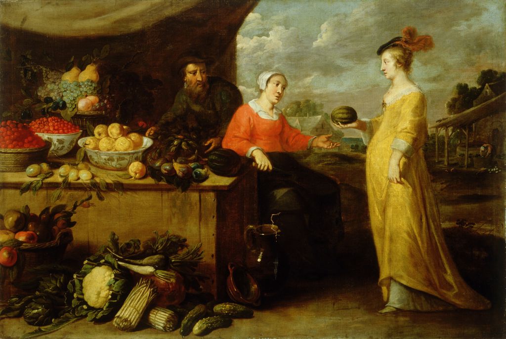 Platni (kat. št. 80 in 81), ki sta pendanta, sta bili namenjeni za zasebnega naročnika kot okras neke obednice, sta pa varianti istega motiva. Na obeh vidimo leseno tržno mizo, stoječo na prostem, na njej pa so različni sadeži, medtem ko leži na tleh vsakovrstna povrtnina. Na prvi sliki gosposki par v spremstvu črnega služabnika in psička izbira sadeže, ki jih ponuja v nakup prodajalka. Na drugi sliki kupuje dama melono od dveh prodajalcev. Stavbe v ozadju so tipične za flamsko deželo. Sliki sta značilni za slikarstvo, ki je cvetelo v Antwerpnu v večjem delu 17. stoletja, ter kaže tržne prizore, pri tem pa povezuje figure in velika tihožitja različnih zvrsti (sadje, zelenjava, ribe, meso). Podobe te vrste sta navadno slikala po dva umetnika: eden je slikal figuralne dele, drugi pa je bil mojster tihožitij; tudi veliki slikarji so sodelovali pri delih take vrste.–Tule razstavljeni platni sta skromnejša primerka te slikarske produkcije in njuno avtorstvo še ni razrešeno. Ni izključeno, da gre v tem primeru tako pri figurah kot pri tihožitjih za delo iste roke. Poudariti moramo, da kažejo slike takih povrtnin in zlasti sadja mnogo skupnega z deli Jana van Kessla starejšega (1626–1679), ki je vodil zelo aktivno delavnico. – Deli smo datirali med leti 1650 in 1660. V svoji vrsti kažeta namreč napredno stopnjo, v kateri so realistični naglasi speljani v dekorativno smer. To potrjujejo tudi bogate, drage porcelanaste posode, v katere je nenaravno naloženo sadje na tržnih mizah. Landesmuseum Joanneum v Gradcu hrani sliki istega naslova in istih mer. Prodajalka sadja na trgu, o. pl., 115 x 171 cm, inv. št. 506 in 673, ki sta deli iste roke, kot jo najdemo na naših slikah (izključeno pa ni sodelovanje dveh slikarjev). Graški podobi povzemata isti model, vendar je ta v nadrobnostih močno spremenjen, zlasti kar zadeva figure in tihožitja.